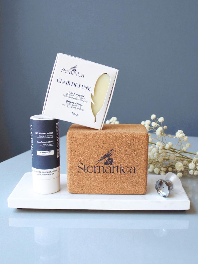 Un savon pour la peau, un déodorant solide, une boîte en liège pour emporter vos soins partout, et un porte-savon aimanté pour les faire durer.